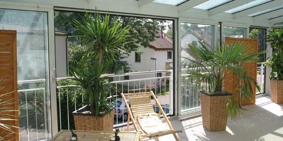 Die Ganzglas-Schiebeanlagen haben keine wärmedämmende Wirkung, sondern schützennur vor Wind und Regen. Dafür sind die Ganzglas-Schiebeanlagen extrem filigran, unvergleichlich transparent und lassen deshalb am meisten Tageslicht in die dahinterliegenden Räume.